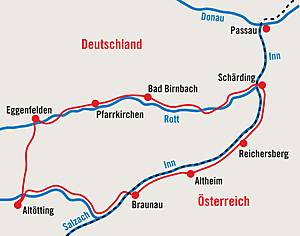 Auch heute folgen wir wieder der Rott und gelangen zunächst nach Pfarrkirchen. Hier weist das "Wimmer-Ross", eine lebensgroße Bronzestatue, auf die einst große Bedeutung des Pferdes im Rottal hin. Auf dem Rott-Inn-Radweg radeln wir weiter nach Altötting (weltbekannter Wallfahrtsort).